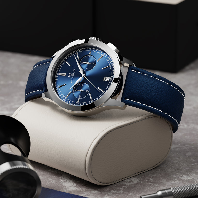 Strap: Genuine blue leather, clasp in rhodium-plated stainless steel