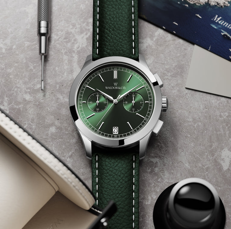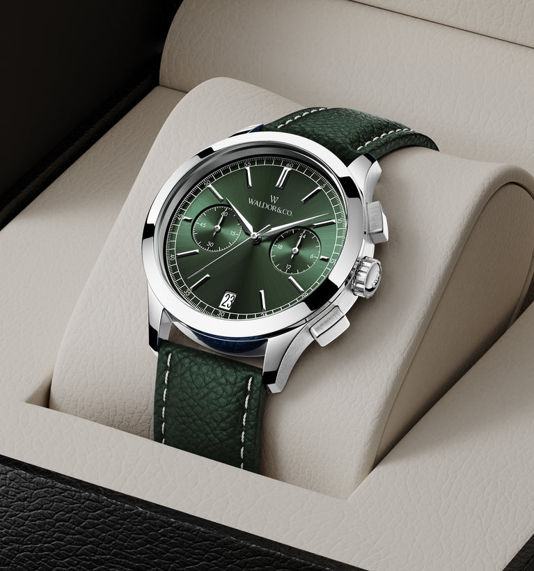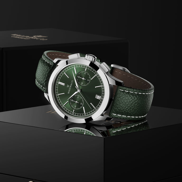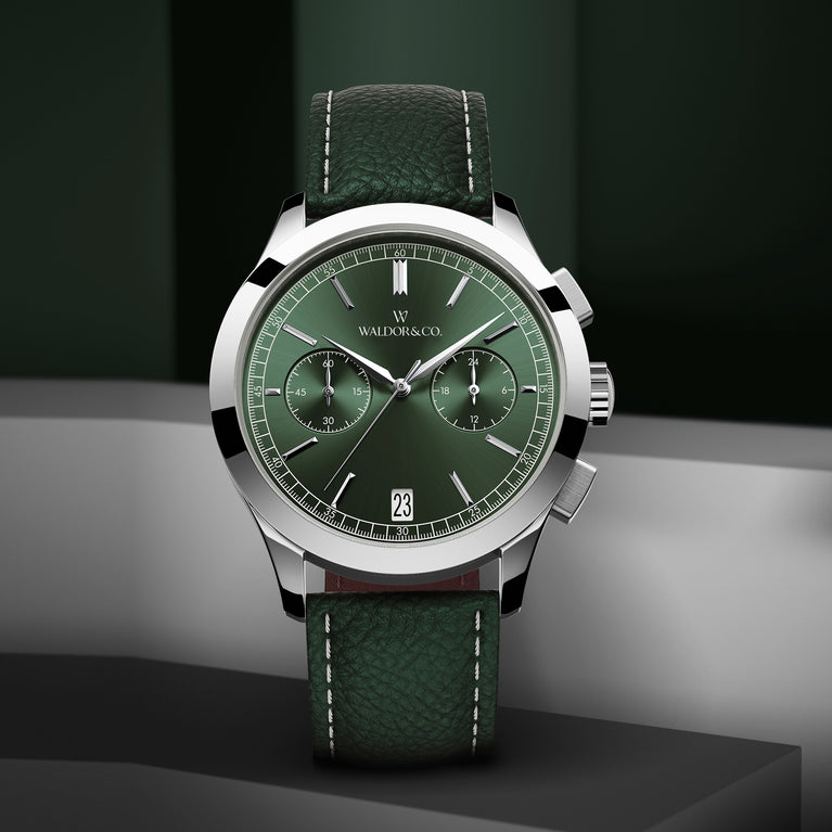 Strap: Genuine green leather, clasp in rhodium-plated stainless steel