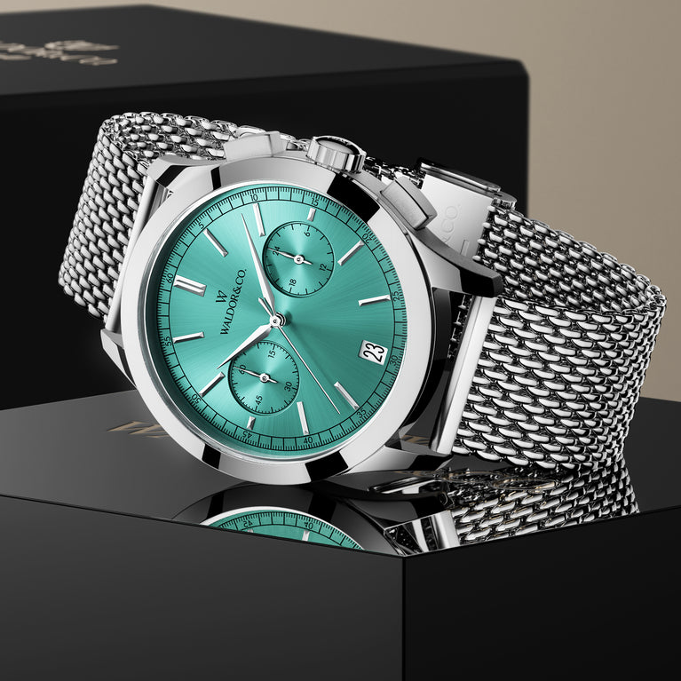 The vivid turquoise dial of the Chrono 39 Sardinia captures the essence of Sardinia’s crystal-clear waters, embodying the serene elegance of the Mediterranean. This unique shade is both vibrant and richly nuanced, crafted to catch the light and mirror the sun’s reflections on the ocean’s surface.