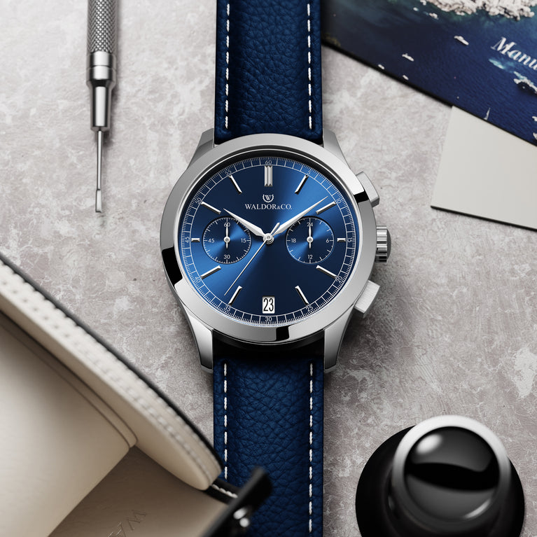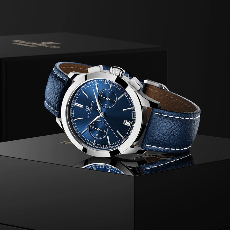Strap: Genuine blue leather, clasp in rhodium-plated stainless steel