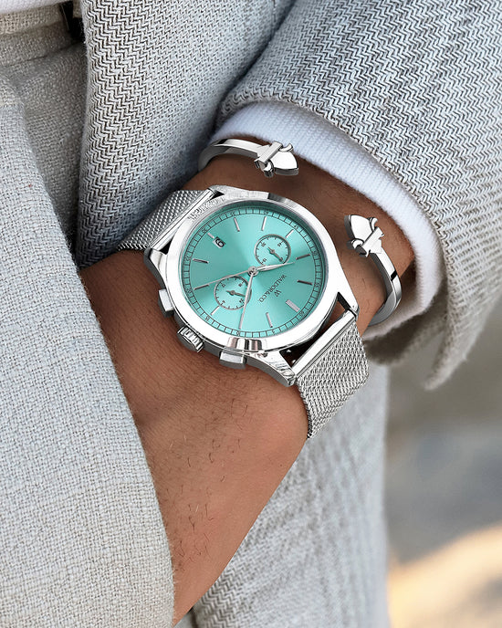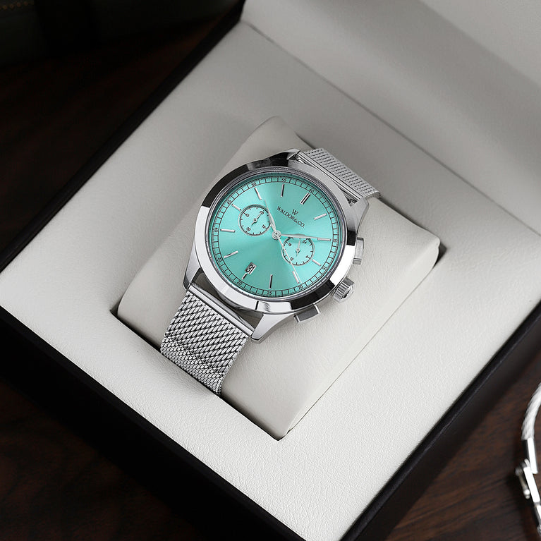 The Chrono 44 Sardinia boasts an aqua turquoise background, accented by applied numerals and indices for crisp legibility. It features two recessed sub-dials that serve the chronograph function, enabling precision timekeeping, along with a central second hand dedicated to the stopwatch feature. A tachymeter scale encircles the dial's perimeter, adding functionality for measuring speed over a known distance.