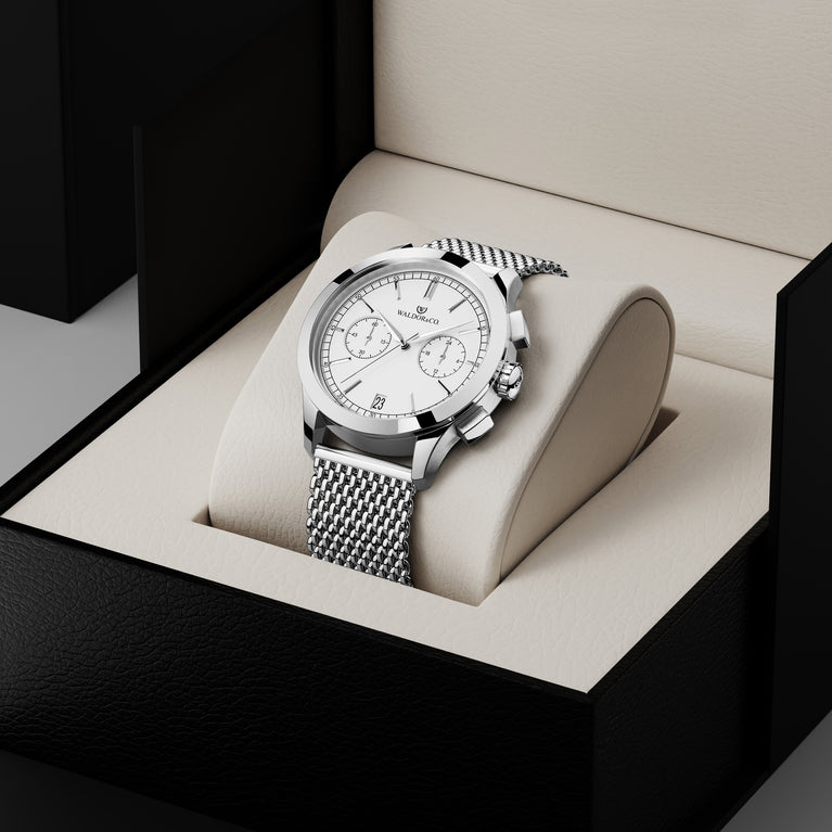 Strap: Mesh strap in rhodium-plated 316L stainless steel